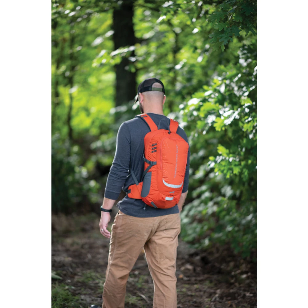 Cycling, running, hiking and climbing are all sports requiring different training, disciplines and equipment, but no matter your passion, there is one thing every athlete must have—quick and easy access to adequate amounts of water. Being without water can quickly become dangerous, and a well-designed hydration pack is the perfect solution. The array of hydration packs designs from ALPS Mountaineering makes carrying water easy and convenient! The Hydro Trail 17 comes equipped with a 3L ALPS hydration reservoir, but is so much more than just a hydration pack. The pack features a large main storage compartment, a front organizer pocket, stretch side pockets, trekking pole loops and side compression. A suspended mesh back panel allows for enhanced breathability and airflow without compromising fit. Complete with reflective details and built-in rain cover the Hydro Trail 17 is an all-in-one pack perfect for hauling your most essential gear.
