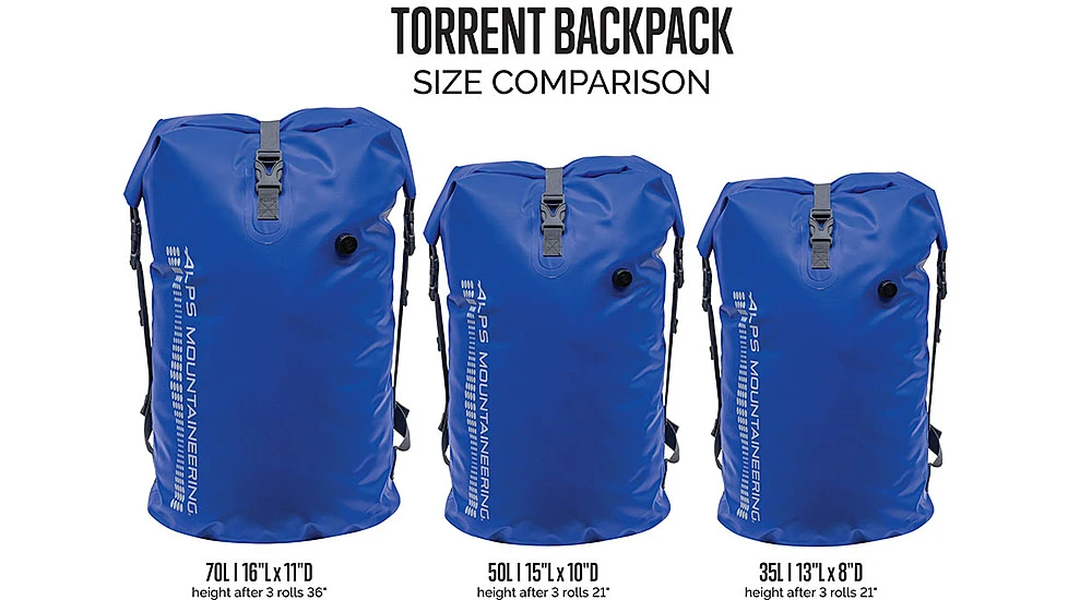 Conquer your next rugged outdoor adventure with the Torrent Backpack. Built using an extra durable waterproof PVC coated 500D polyester material, the Torrent offers superior protection in all varieties of wet conditions. A secure roll top closure and strong fully welded seams assure your gear is shielded from moisture. You can rest assured you will arrive at your destination with dry gear. Adjustable shoulder straps make for easy hauling and roll top buckles provide easy lashing points for extra gear or convenient method of attaching to your water craft. The Torrent Backpack is designed with an oval-shaped flat bottom for self-standing and easy access. With the Torrent Series added to your essential gear collection, your next feat awaits you. Offered in three capacities to fit everyone’s needs 35L, 50L and 70L.![]()